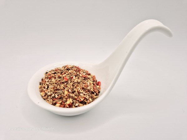 Zutaten: Paprikaflocken, Senfkörner, Koriander, Kümmel, Pfeffer, Zwiebel, Basilikum, Piment, Wacholderbeeren, Chili