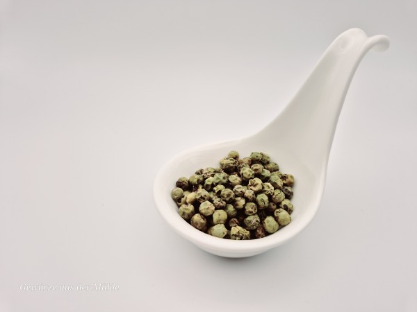 Hat weniger Schärfe als weißer und schwarzer Pfeffer. Aufgrund des feinen und intensiven Aromas eignet er sich vorzüglich für Soßen. Der grüne Pfeffer entsteht aus unreif geernteten Früchten, die gleich nach der Ernte in Lake eingelegt werden.